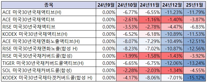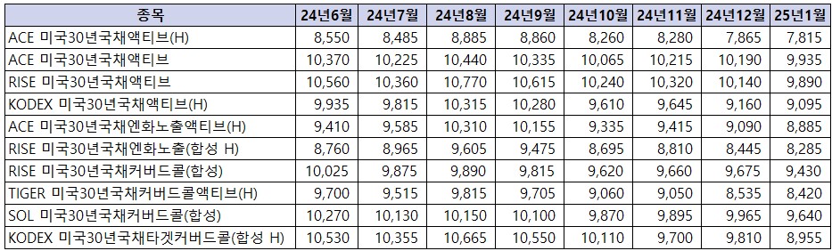 - 미국채금리 인상기인 10월~1월 중에 선택을 했다면 ACE 미국30년국채액티브, RISE 미국30년국채커버드콜(합성), SOL 미국30년국채커버드콜(합성) 중에 선택을 했겠죠.