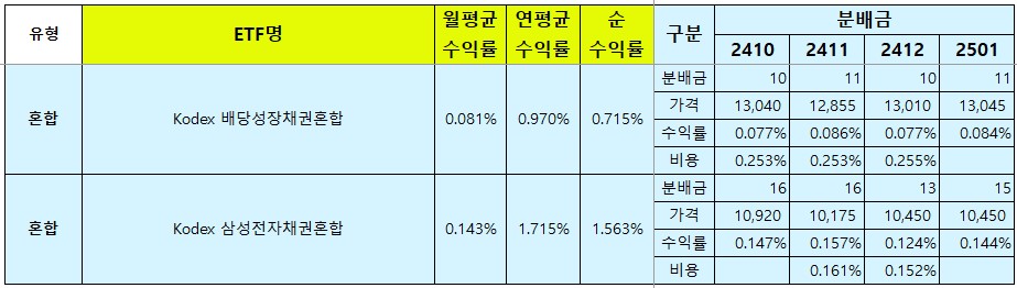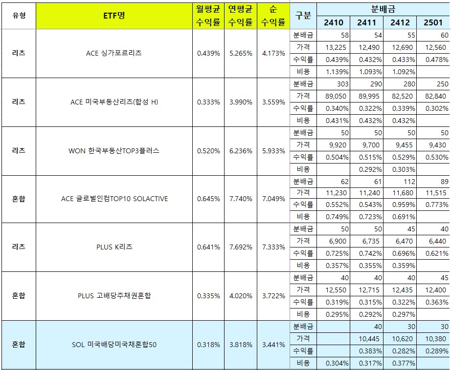 - 상장한지 가장 오래된 종목은 ACE 미국30년국채액티브(H)로서 월배당을 총 40번을 지급했구요, 가장 최근에 상장된 종목은 KODEX 미국30년국채액티브(H)로서 25년 1월까지 총 7번의 월배당을 실시했어요.