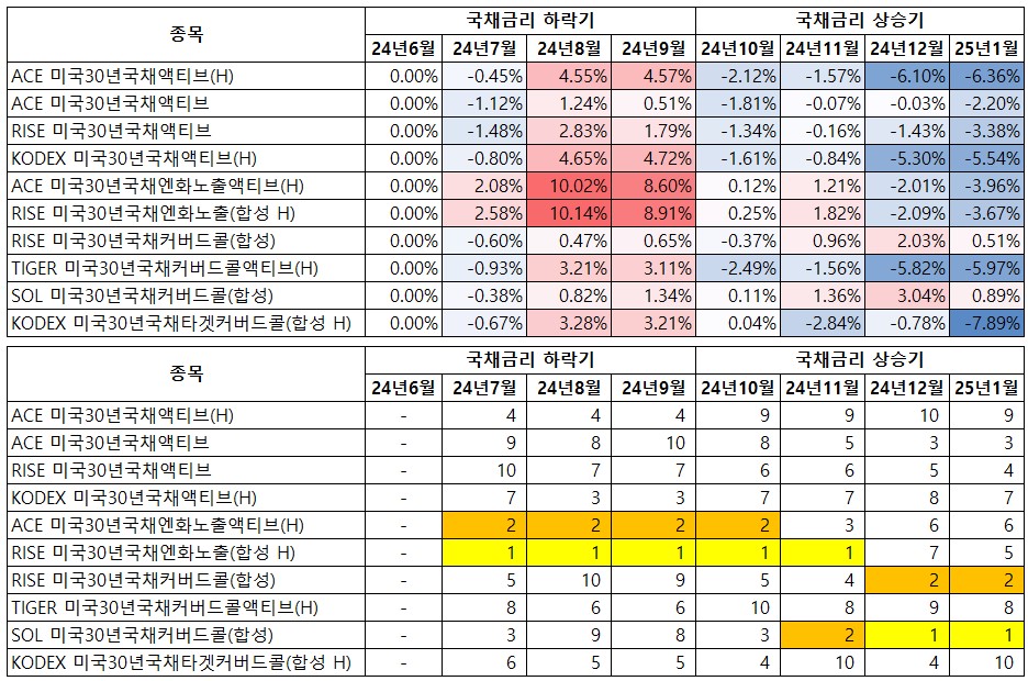 - 그리고 아래에 있는 표는 매월 수익률 순위를 1위~10위까지 표시한거에요. 미국채금리 인하기 때는 엔화노출 두 종목이 지속 1, 2위를 하다가 국채금리 상승기 때는 순위가 바뀌었어요.