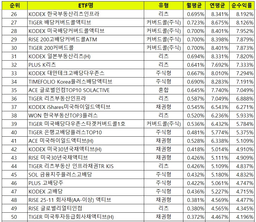 - 그랬을 때 1월 말 기준 플러스 수익률을 기록한건 RISE 미국30년국채커버드콜(합성)과 SOL 미국30년국채커버드콜(합성) 두 종목 뿐이고, 나머지는 모두 마이너스 수익률을 기록 중이에요.