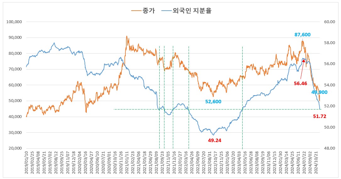 가장 최근 외국인 지분율이 51.72% 이었을 때는 23년 4월말 경으로 당시 주가는 약 65,000원 정도였고, 그 이전에도 주가는 항상 7만원 이상에 있었던 것을 알 수 있어요.