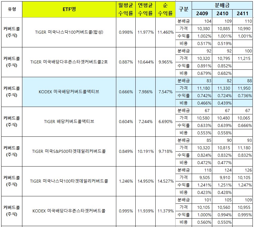 • 수익률 상위 1~24위까지는 모두 커버드콜 종목이고 커버드콜 종목이 아닌 종목 중에는 리츠 ETF인 KODEX 한국부동산리츠인프라가 연수익률 7.85%로 가장 높네요.