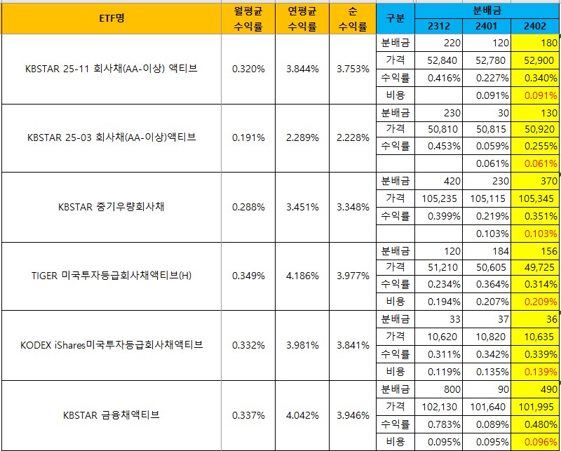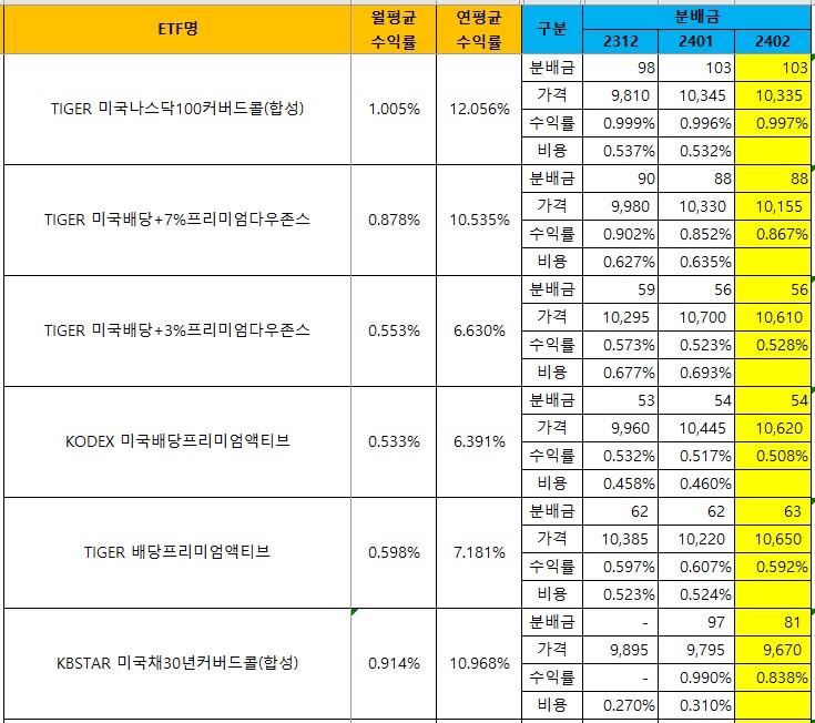 국내에 상장되어 있는 국내 월배당 ETF 리스트와 종목별 월 분배금, 월평균 수익률, 연평균 수익률, 그리고 매달 발생하는 비용을 업데이트 하고 있어요. 24년 2월 분배금 업데이트 하여 정리했어
