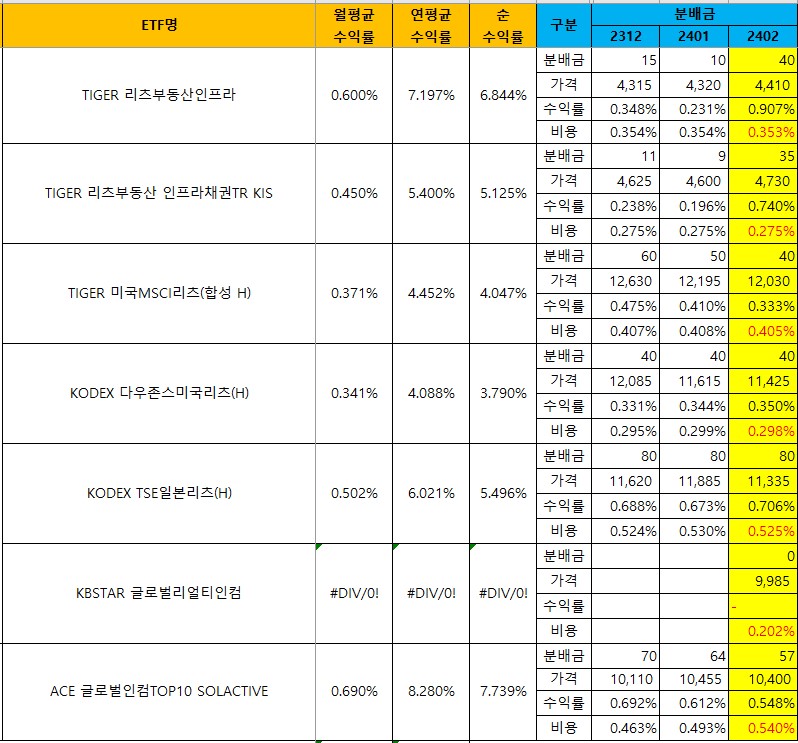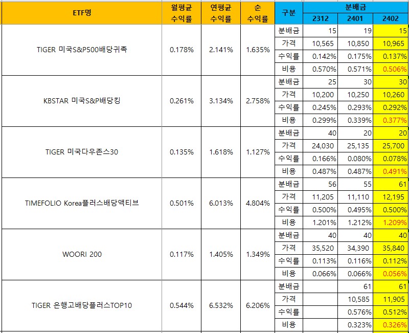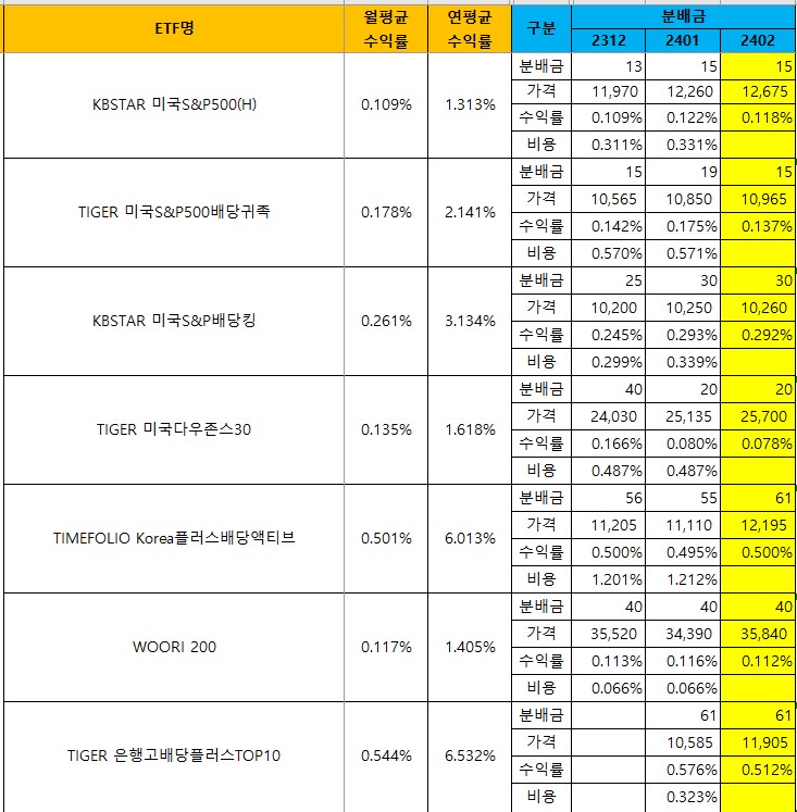 24년 2월 분배금 업데이트 하여 정리했어요.