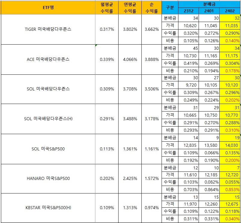 - "월평균"은 최근 1년 지급된 분배금의 평균 값이구요, "연 환산"은 월평균 값에 12를 곱한 값이고, "2월비용"은 말 그대로 2월달에 ETF 운용에 따른 비용, "순수익률"은 연환산 배당률에서 2월 비용을 뺀 값이에요.