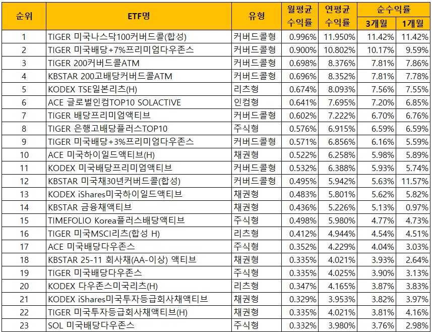 - 순위 1~4등은 모두 커버드콜 유형이고, 5등은 일본리츠가 차지했네요.