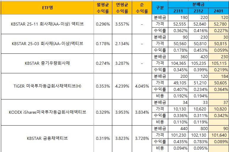 - 가장 높은 수익률은 ACE미국하이일드액티브 종목이 비용 반영한 연수익률이 5.85%로 가장 높으며,