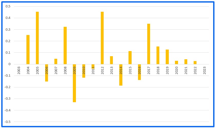 - 2016년 이후로는 막대 그래프가 모두 양의 값을 가지므로, 2016년을 기점으로 배당이 조금씩이나마 성장했어요.