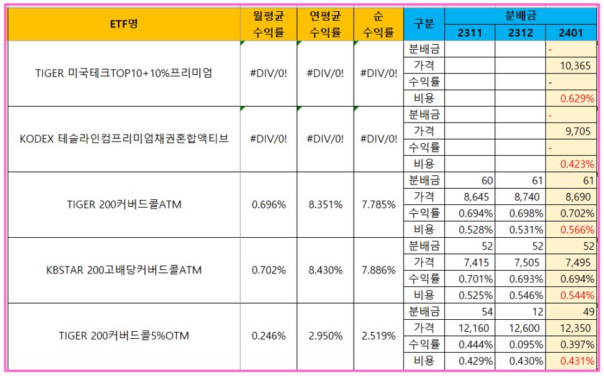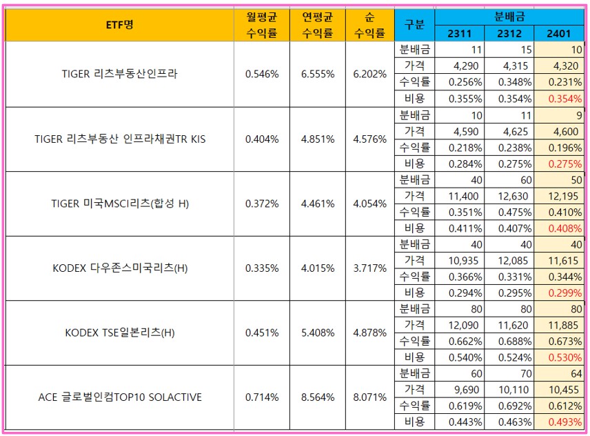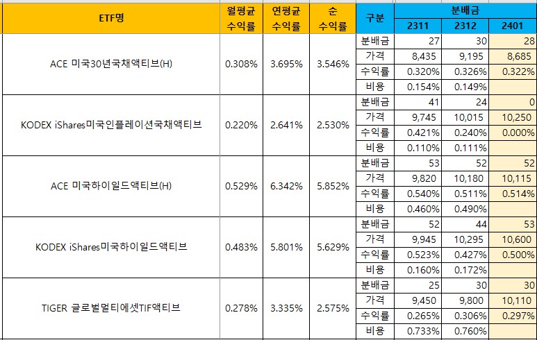 국내 상장된 월배당 ETF의 24년 1월 비용이 오늘 공개되었어요.