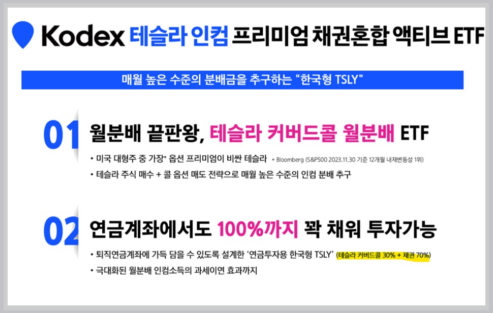 . 종목명 : Kodex 테슬라인컴프리미엄채권혼합 액티브 ETF (종목 코드 : 475080)