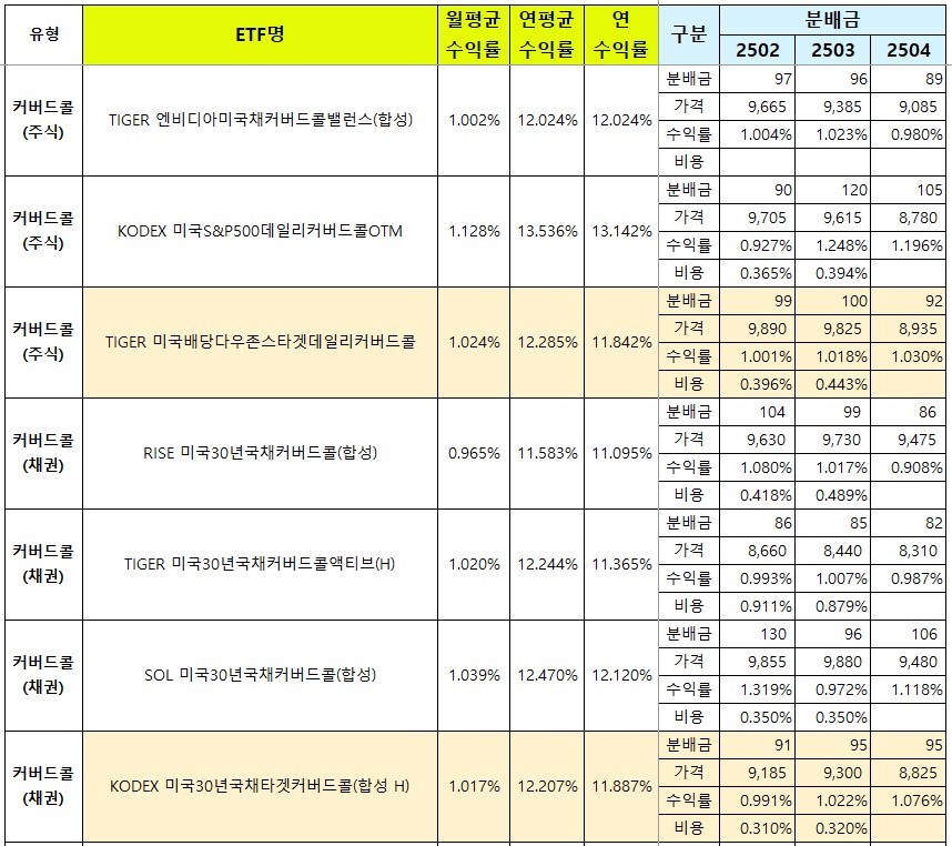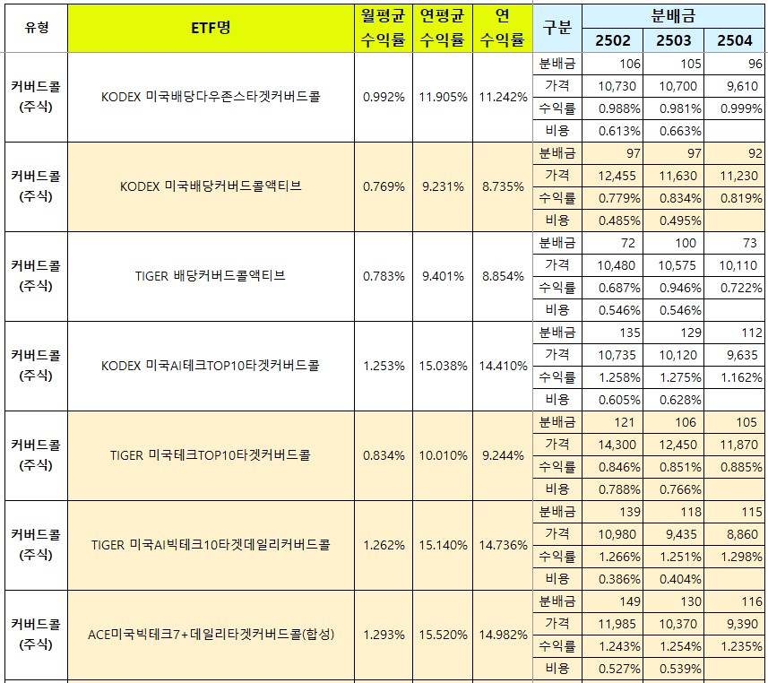 특히 커버드콜 전략을 활용한 상품들이 주목받고 있는데요, 이는 기초자산의 배당 외에도 콜옵션 매도 수익을 추가 배당으로 제공하기 때문입니다.