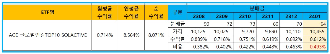 국내 월배당 ETF 중 월평균 0.7%, 연 환산 8% 정도의 분배금을 지급하는 ACE 글로벌인컴 TOP10 SOLACTIVE 라는 종목에 대해서 좀 알아봤어요.