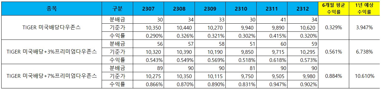| TIGER 미국배당다우존스 3총사 성과 비교 (3%프리미엄, 7%프리미엄) (1) | 2024.01.22 |