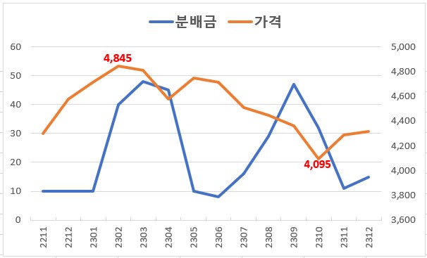 즉 분배금의 크기에서도 차이가 있지만, 가격에서도 약간의 차이가 있었네요.