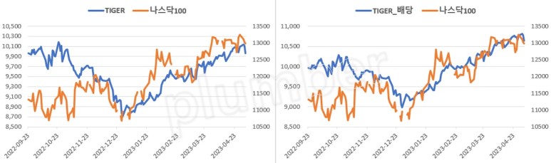 - 왼쪽은 ETF의 가격으로만 비교하였고, 오른쪽은 ETF의 가격에 매달 받은 배당금을 반영하였어요.