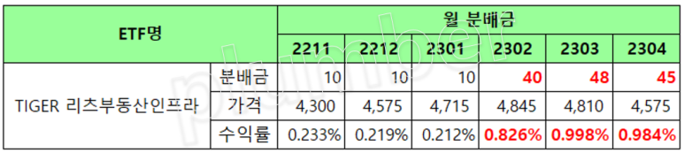 | [TIGER리츠부동산인프라] 역대 분배금 지급 내역 (0) | 2024.01.01 |