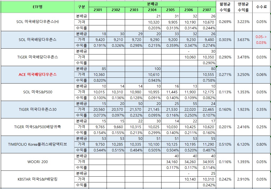 비용이 가장 저렴한건 TIGER 미국배당다우존스 이지만, 순수익률에서 가장 우세한건 ACE 미국배당다우존스네요.