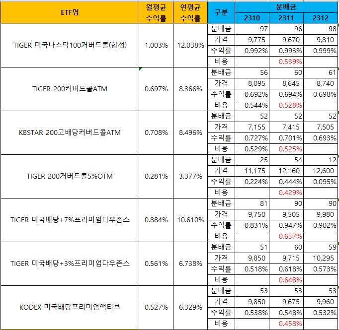 . 연수익에서 비용을 뺀 순수익률이 가장 높은건 역시 TIGER 미국나스닥100커버드콜 이며, 11.5%의 순수익률이네요.