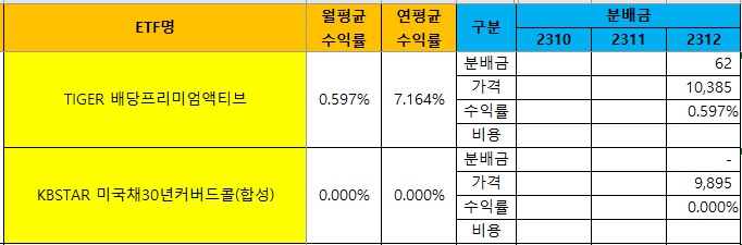 | [국내월배당ETF] 12월 분배금 정리 (1) | 2023.12.30 |