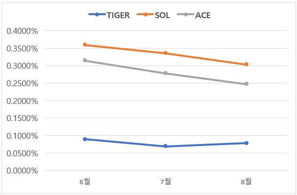 . K-SCHD 3총사인 TIGER, ACE, SOL 미국배당다우존스 중 이번달도 비용이 가장 저렴한건 TIGER 에요.