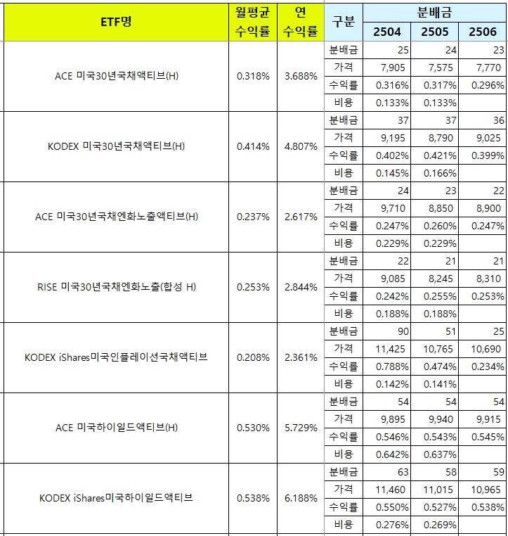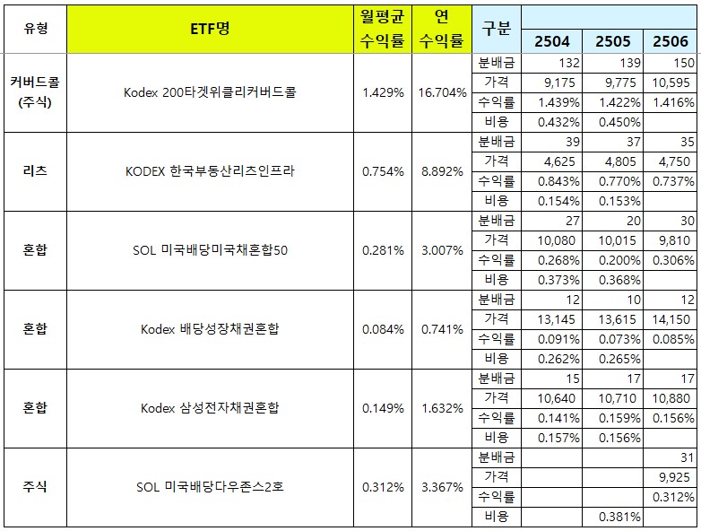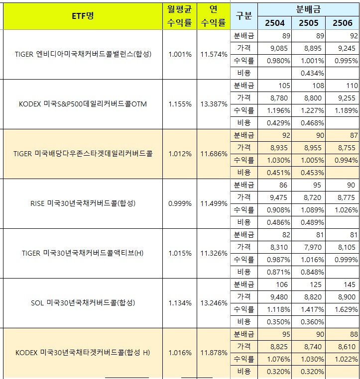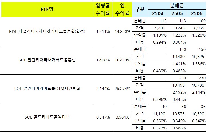 국내에 상장된 국내 월배당 ETF 리스트와 종목별 월 분배금, 월평균 수익률, 연평균 수익률, 그리고 매달 발생하는 비용을 업데이트 하고 있어요.