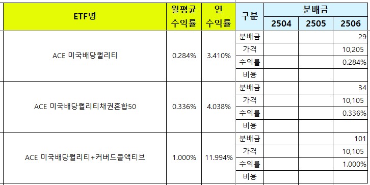 - ACE 미국배당퀄리티가 5월 13일에 상장하여 처음으로 리스트업 되었는데요, 6월 배당금에는 5월의 보름치가 포함되어 있었기 때문에 이번달에 지급하 0.083%가 실제 수준이며, 이를 연으로 환산 시 0.996%로 1%가 안되는 수준이에요.