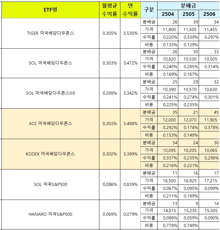 아래 표에서 "연수익률"은 수수료까지 반영한 배당수익률로 실질적인 수익률이에요.