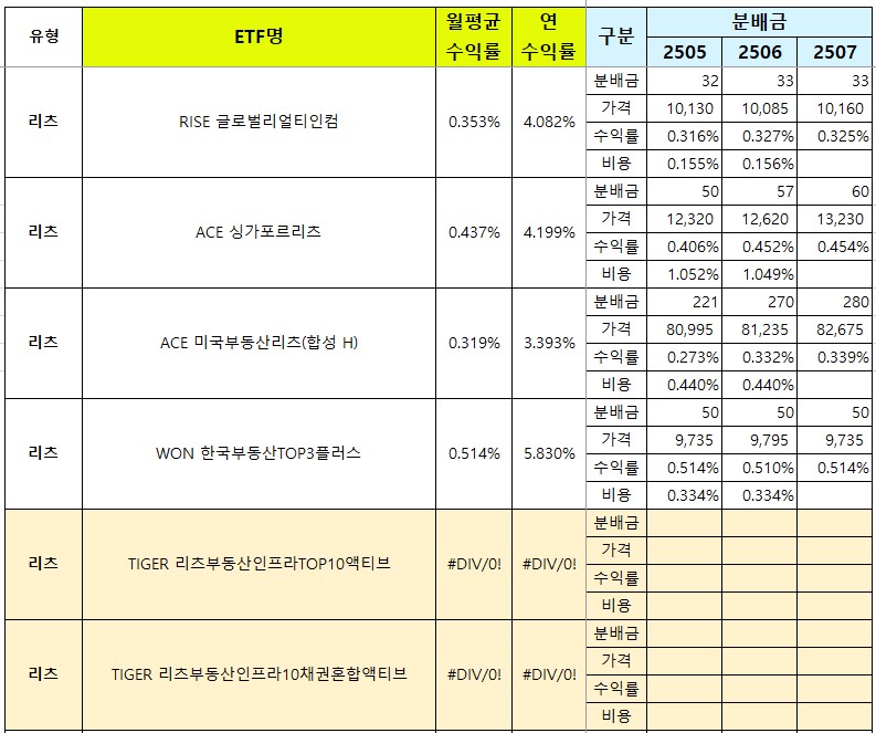 - 수익률 : 매월 분배금을 가격으로 나눈 값