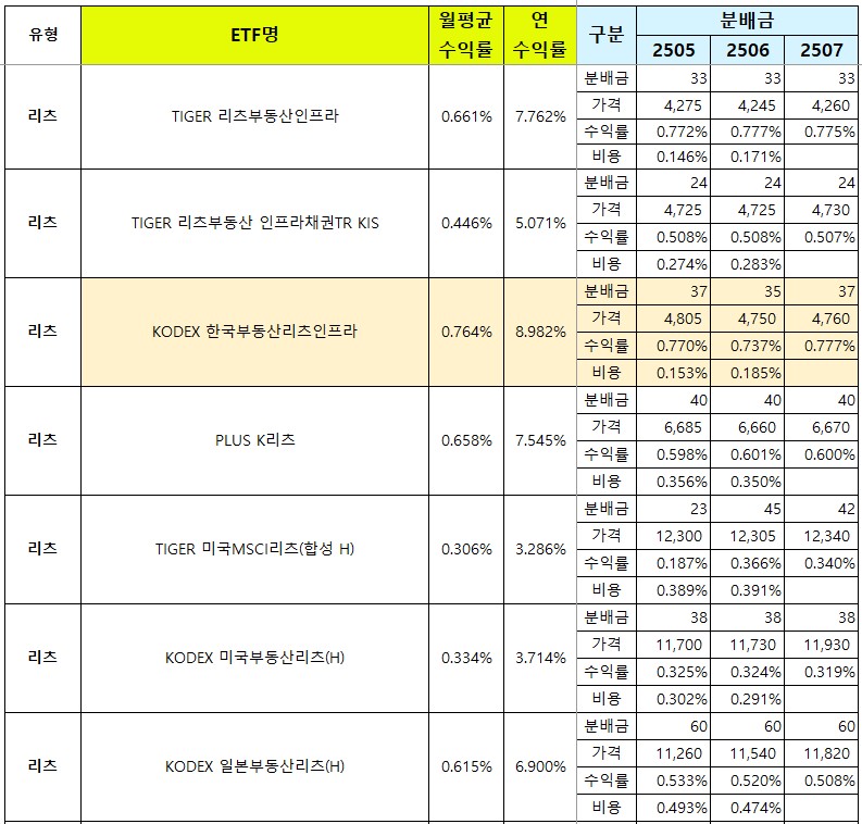 - 커버드콜이 아닌 종목 중에서 가장 높은 배당금을 지급하는건 KODEX 한국부동산리츠인프라에요. 국내 리츠 ETF의 양대산맥(?)인 TIGER 리츠부동산인프라는 배당수익률 7.76%로 KODEX 대비 상대적으로 낮은거 같지만, 이는 TIGER 리츠부동산인프라의 배당정책이 변경되었기 때문으로 실제론 TIGER 또한 약 9%의 배당수익률이 나와요.