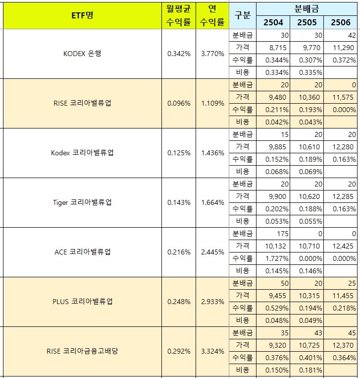 - 국내 금융지주 및 코리아밸류업 ETF 들도 배당수익률 대비 주가수익률이 최근에 좋아졌어요.