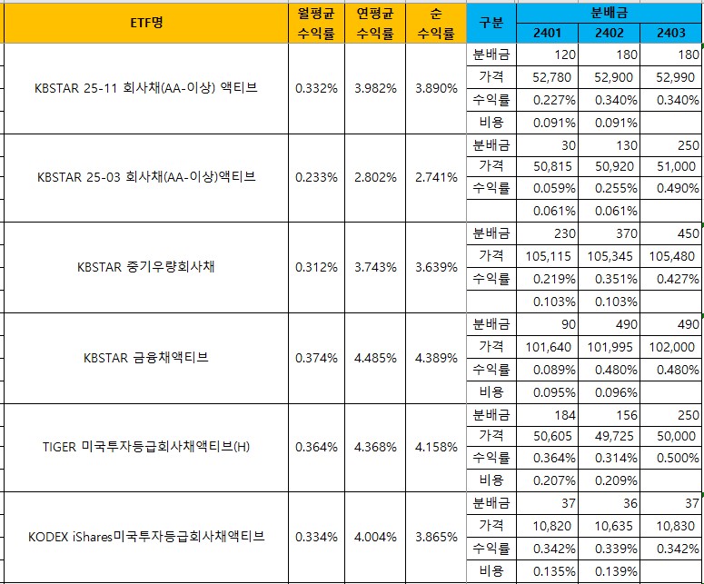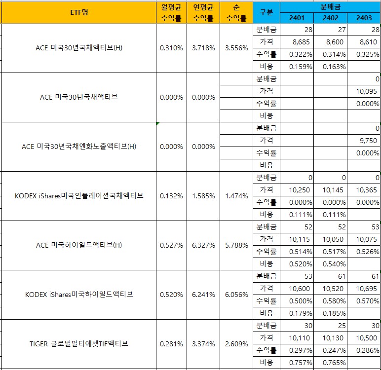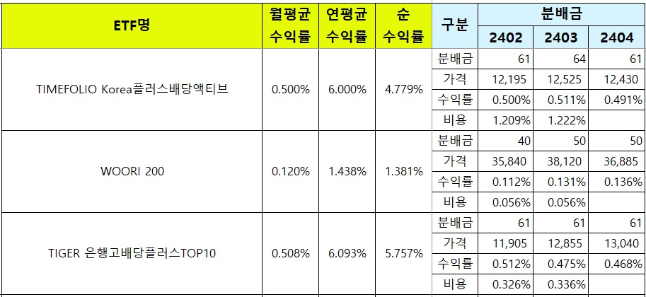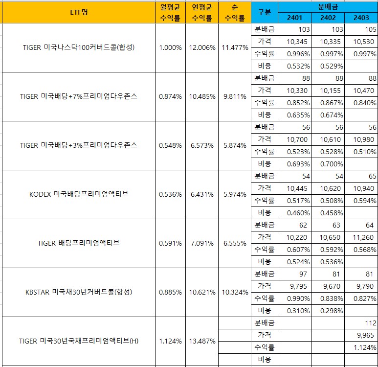 국내에 상장된 국내 월배당 ETF 리스트와 종목별 월 분배금, 월평균 수익률, 연평균 수익률, 그리고 매달 발생하는 비용을 업데이트 하고 있어요.