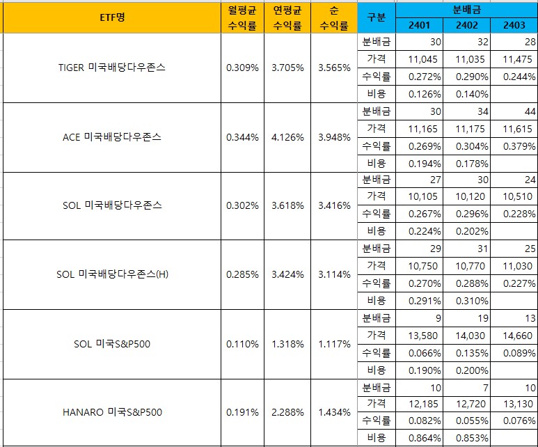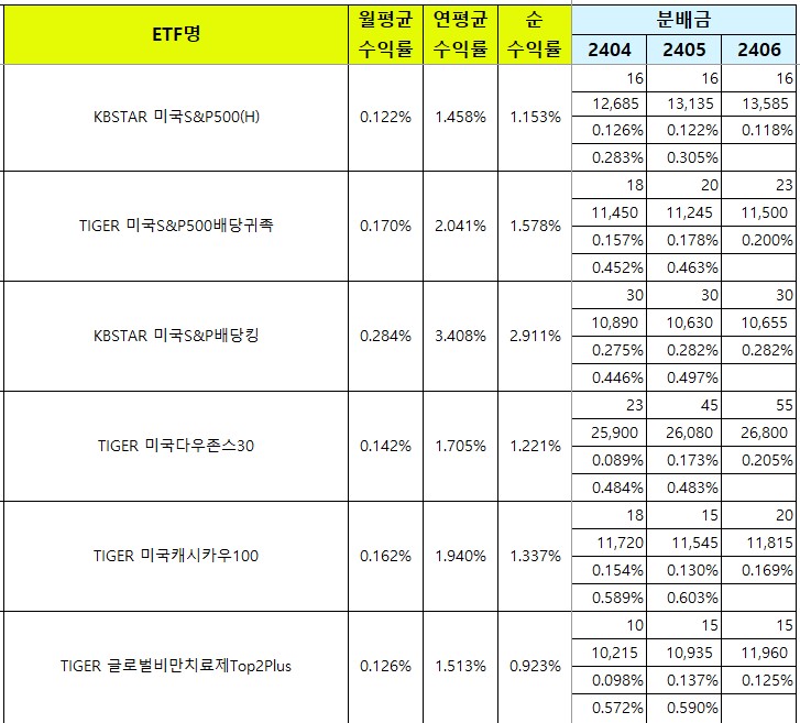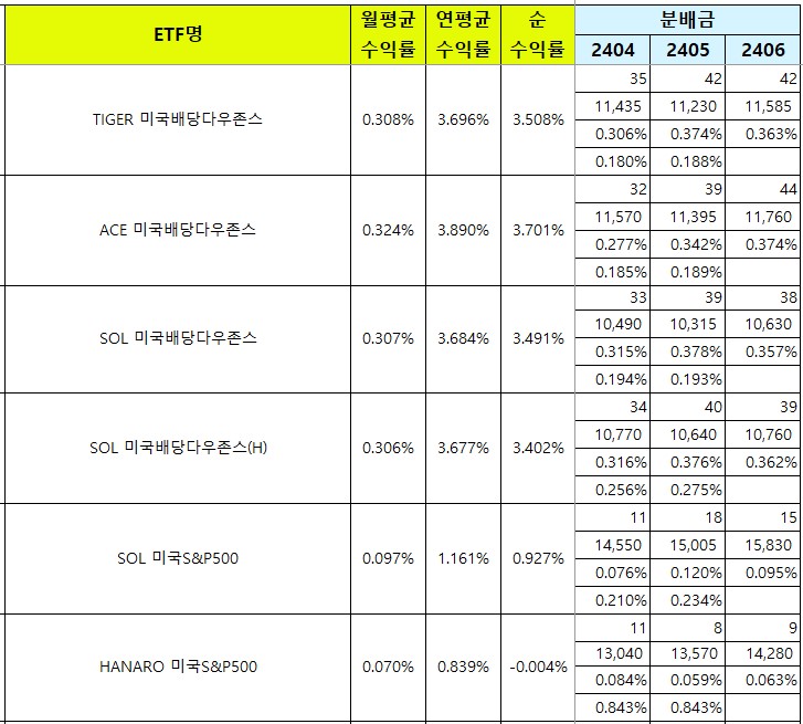 HANARO 미국S&P500은 24년 1월 이후 월평균 배당금에서 비용을 제하고 나면 배당수익률이 0이에요.