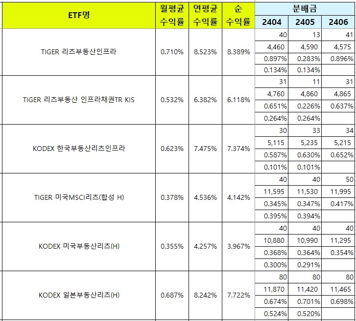 국내, 미국, 일본에 투자하는 리츠 상품들이 있는데요, TIGER 리츠부동산인프라 또는 KODEX 한국부동산리츠인프라는 연분배금 수익률이 7~8% 정도 되는데요, 이 정도 수익률이면 수익형부동산에 투자하여 공실 걱정, 매도 걱정하는 것보다 나은 선택이 될 수도 있다고 생각해요.