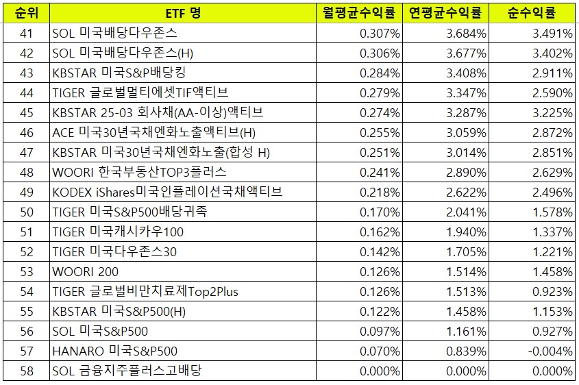 제가 파악하고 있는 월배당 ETF 총 58개에 대해서 배당수익률이 높은 것부터 나열해봤어요.