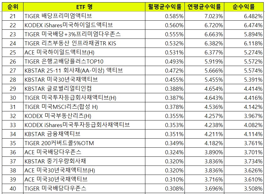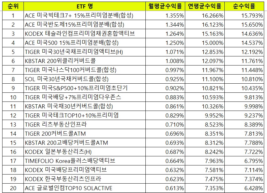 지난달엔 KODEX 테슬라인컴프리미엄채권혼합액티브가 배당수익률 1위에 있었으나, 이번달엔 ACE 미국빅테크7+ 15%프리미엄분배 종목이 1위에 올랐어요. 그 외에 ACE 15% 3총사인 ACE 미국반도체15%프리미엄분배가 2위에, ACE 미국500 15%프리미엄분배가 4위에 올랐어요. ACE 3총사는 4월 23일날 상장한 이후 이번달에 처음으로 한 달치의 분배금이 지급되었고, 평균 데이타에도 한 달치만 포함이 된 데이타로 추후 데이터도 확인이 필요해요. 비용을 제외하고도 14.5~15%의 배당수익률은 상당하네요.