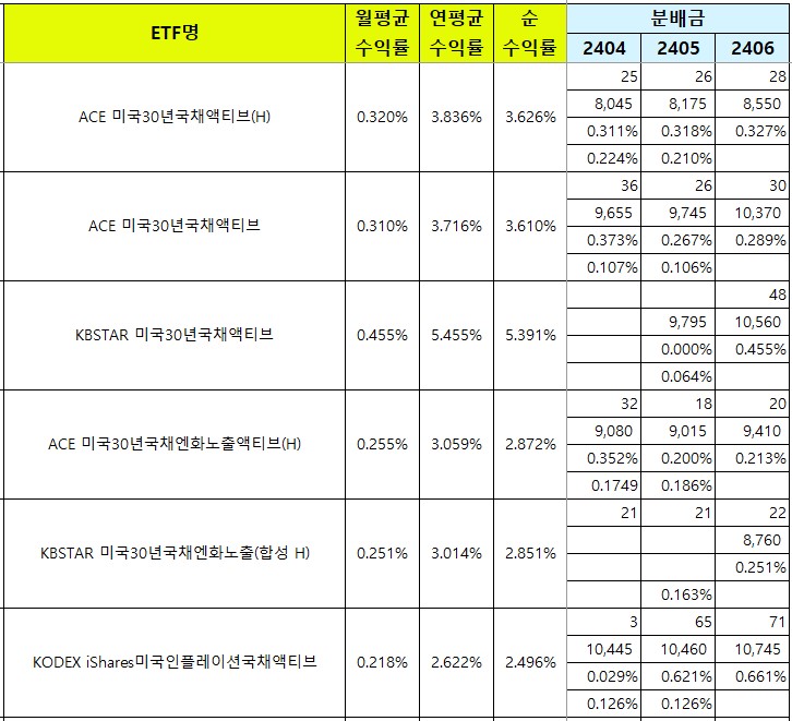 역대급 엔저와 미국채금리에 투자를 하는 ACE 미국30년국채엔화노출액티브, KBSTAR 미국30년국채엔화노출 두 종목 모두 2.8%의 연배당수익률로 계산되네요.
