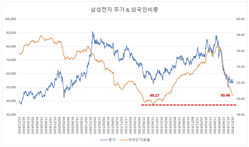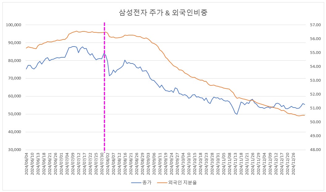 이후 2022년 9월부터 2024년 7월까지 외국인 지분은 49.24%에서 56.46% 까지 7.22% 늘어나는 동안 삼성전자 주가는