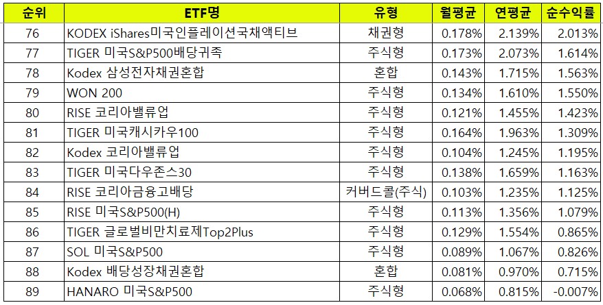 - 그리고 아래에 있는 표는 매월 수익률 순위를 1위~10위까지 표시한거에요. 미국채금리 인하기 때는 엔화노출 두 종목이 지속 1, 2위를 하다가 국채금리 상승기 때는 순위가 바뀌었어요.