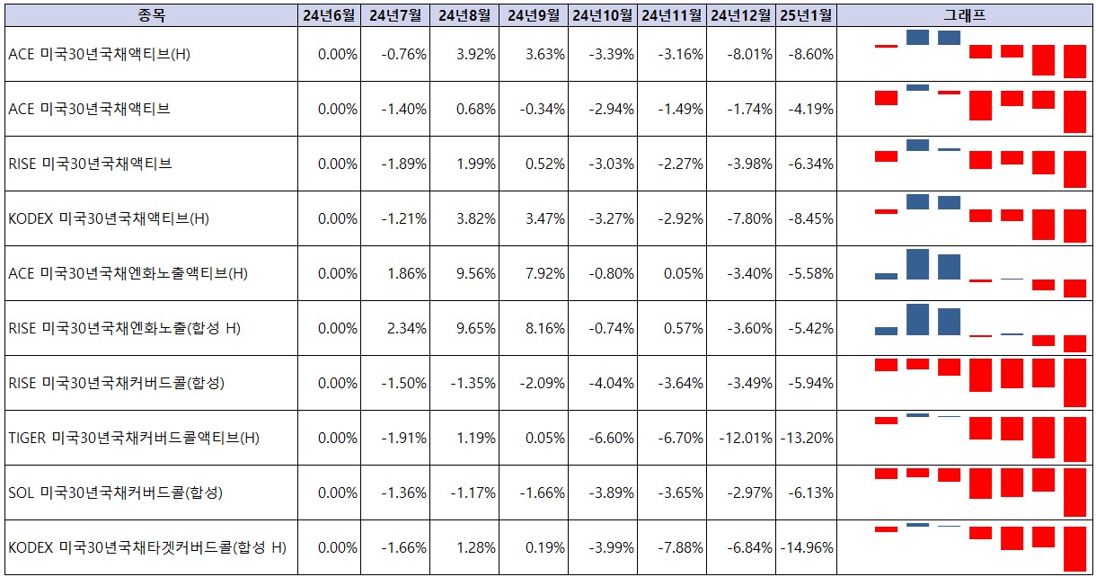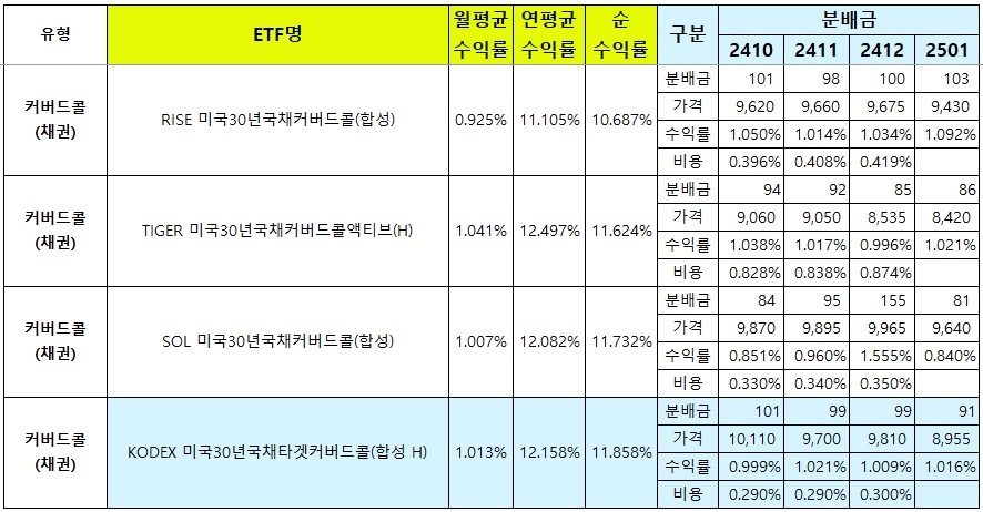 - 미국채금리 인상기인 10월~1월 중에 선택을 했다면 ACE 미국30년국채액티브, RISE 미국30년국채커버드콜(합성), SOL 미국30년국채커버드콜(합성) 중에 선택을 했겠죠.