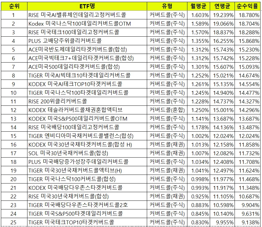 - 개인적으로 월배당을 좋아하는 저로선 SOL 미국30년국채커버드콜(합성)을 선택할거 같네요. (종목 추천 절대 아님)