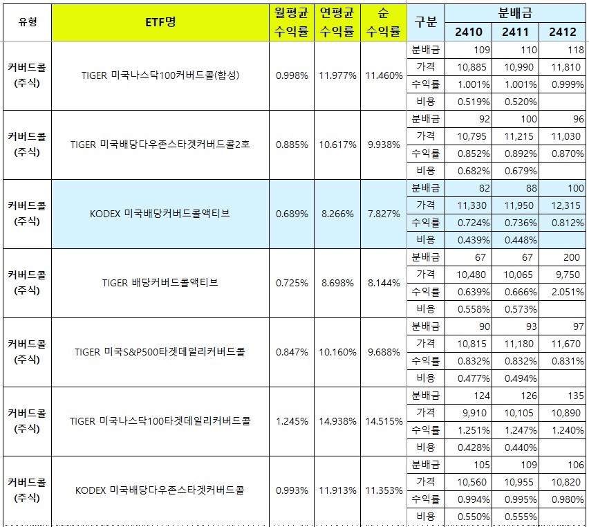 여기까지는 단순히 배당수익률 위주로 정렬해서 봤구요, 아래는 배당금, 주가, 비용 등을 각 ETF의 유형별로 나눠서 볼게요.