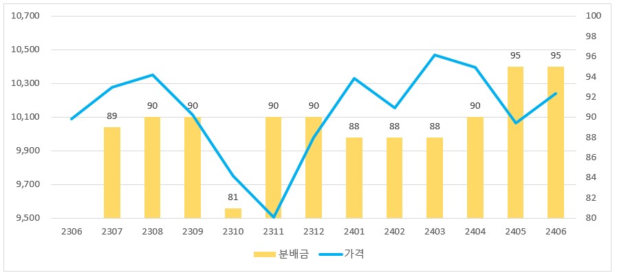 아직 상장한지 두 달 밖에 안된 종목으로 한 번의 분배금이 지급되었으며, 한 번의 분배수익률을 연으로 환산시에 약 10.5% 정도 되는 연수익률이 예상되는 종목이에요.