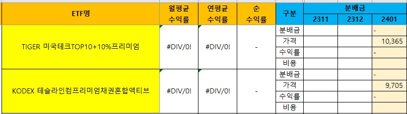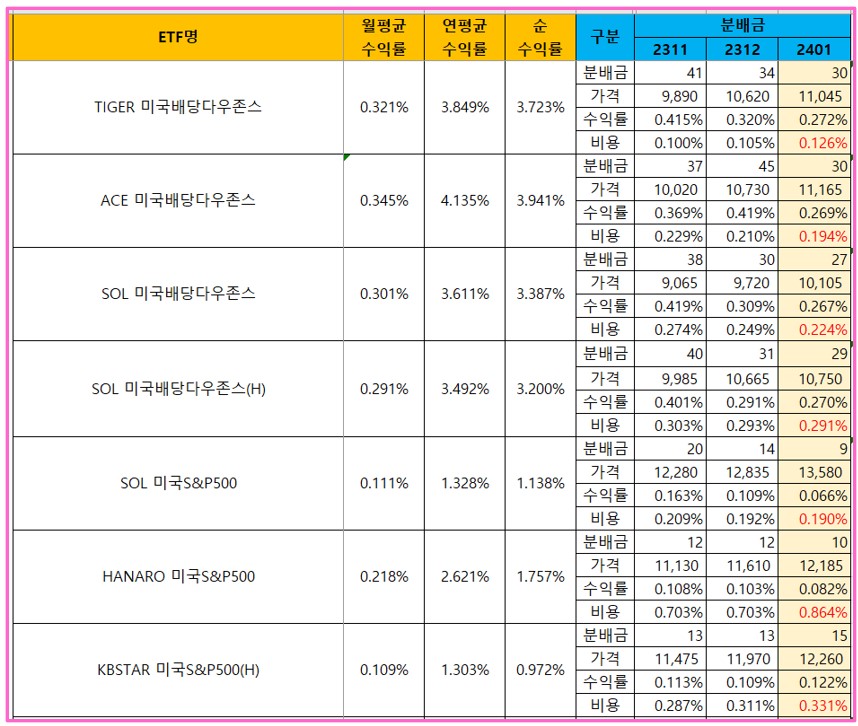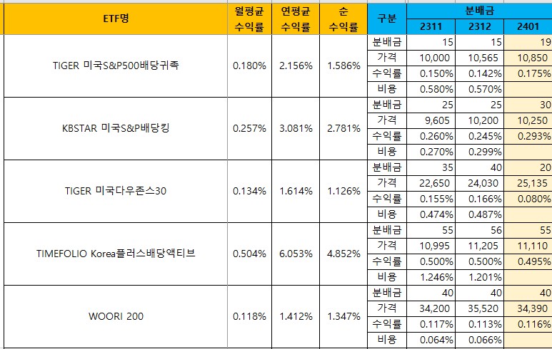 | [국내월배당ETF] 12월 비용 정리 (순수익률) (2) | 2024.01.11 |