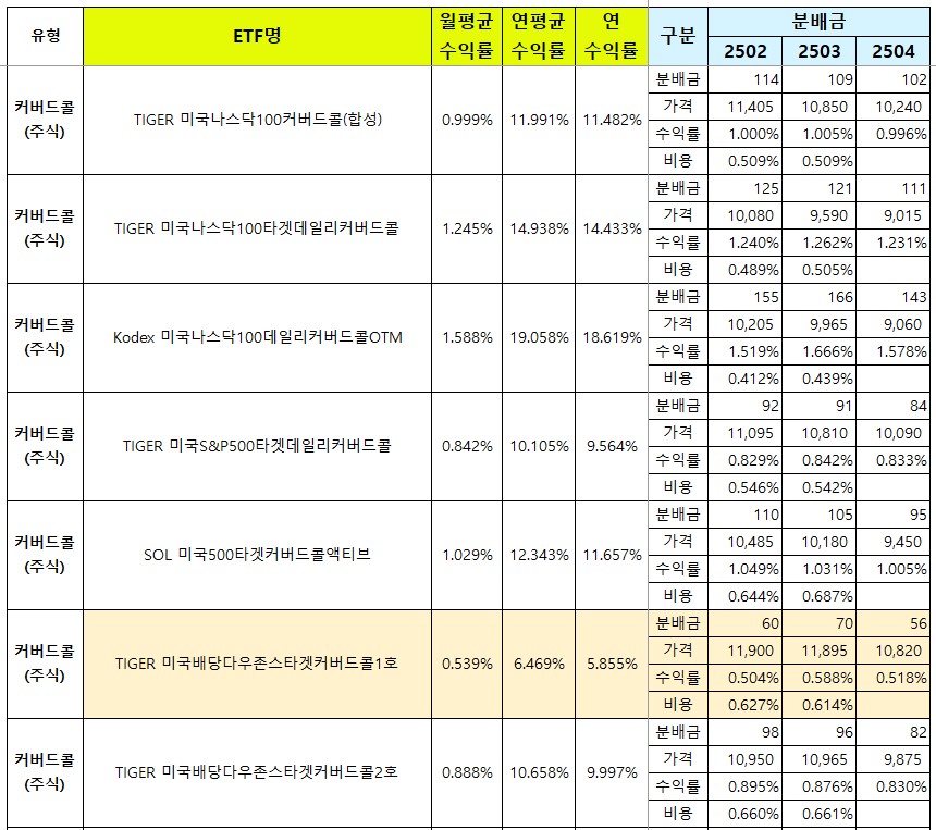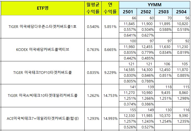 특히 커버드콜 전략을 활용한 상품들이 주목받고 있는데요, 이는 기초자산의 배당 외에도 콜옵션 매도 수익을 추가 배당으로 제공하기 때문입니다.