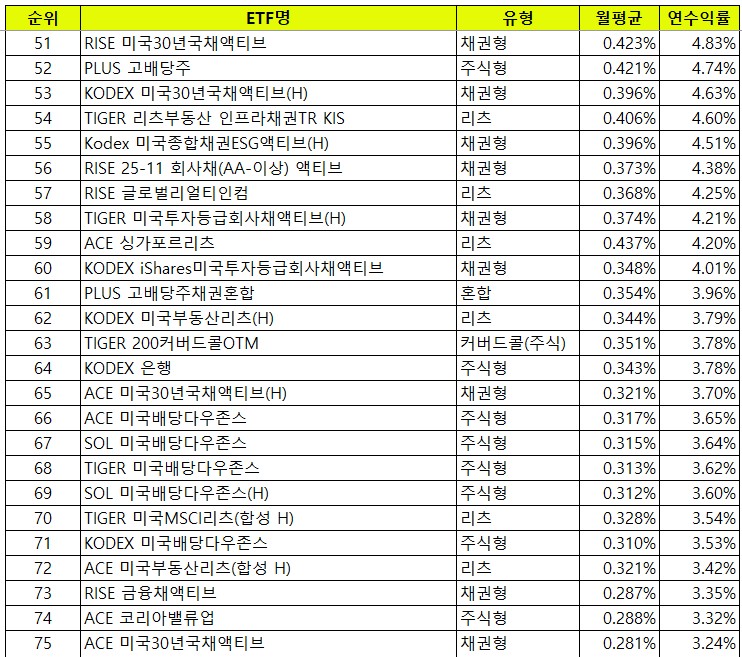 - 한투 ACE 미국30년국채액티브: 2,669억원 순유입 (배당수익률 연 3.2% 수준)