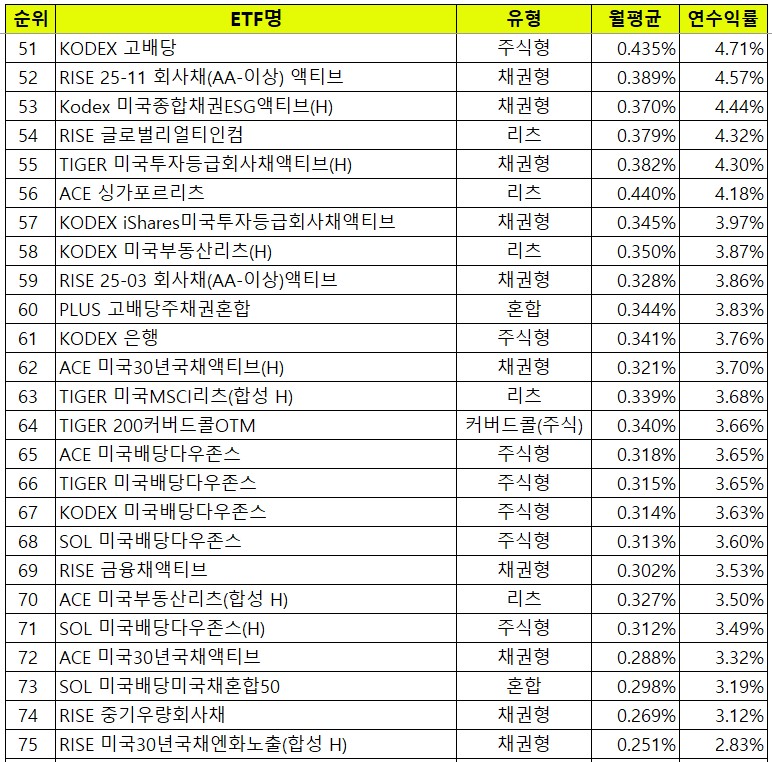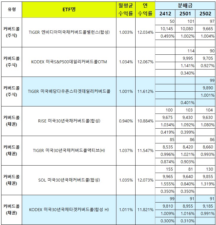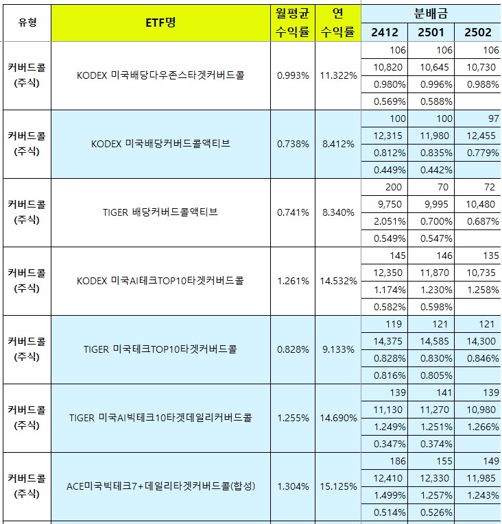 국내 월배당 ETF의 종목별 월 분배금, 월평균 수익률, 연평균 수익률,그리고 매달 발생하는 비용을 업데이트 하고 있어요.