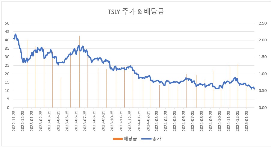 - 파란색은 TSLY(좌측) 주가를 나타내고, 주황색은 TSLA(우측) 주가를 나타내고 있어요.