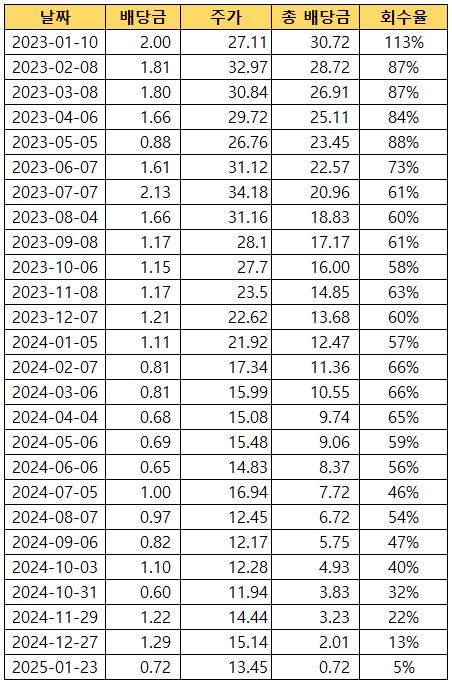- 23년 1월부터 25년 1월까지 25개월 동안 월배당수익률의 평균값은 5.7%에요. 그리고 여기에 12를 곱해서 연배당수익률을 계산해보면 68.4%라는 값이 나오게 되고, 배당수익률 100%가 되어 원금을 완전히 회수하는건 17.5개월이 걸린다는 계산이 나와요.