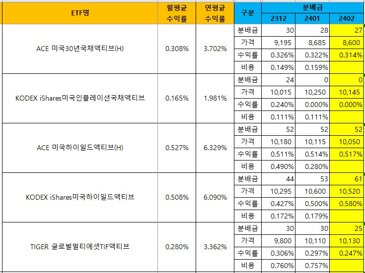 | [국내월배당ETF] 24년 1월 비용 정리 (& 수익률순위) (0) | 2024.02.13 |