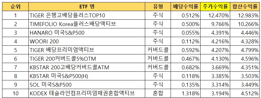 . 국내 주식으로 구성된 커버드콜 유형의 ETF인데요, 배당수익률, 주가 수익률 모두 양호한 3위네요.